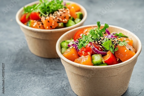 Healthy poke bowl with rice, vegetables, fresh meat or fish