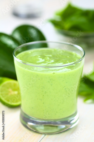 Healthy refreshing green smoothie made of fresh avocado, spinach, lime and yoghurt in a glass on bright wood (Selective Focus, Focus on the front of the glass rim)