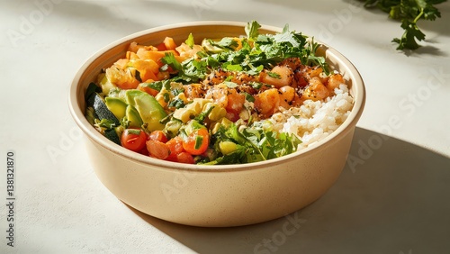 Healthy Rice Bowl with Fresh Vegetables and Seasoned Protein