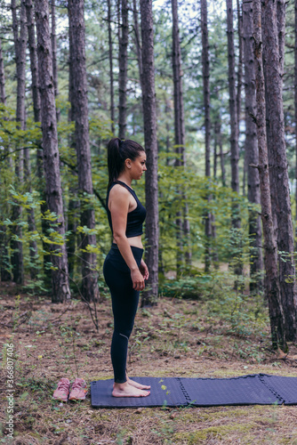 Healthy young sporty woman is standing on a yoga mat in the forest