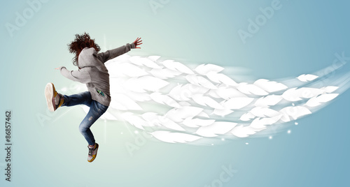 Healthy young woman jumping with feathers around her