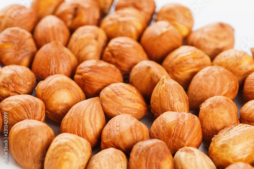 Heap of hazelnuts isolated on white background, macro image