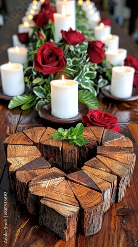 Heart shaped centerpiece with candles and roses, representing love and celebration, festive indoor photography