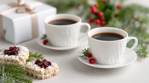 Heart-shaped cookies with jam and coffee cups on the table for Valentine's Day celebration with a gift box and festive atmosphere