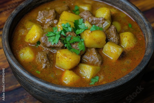 Hearty Beef and Potato Stew Served in Rustic Bowl on a Wooden Table Surrounded by Ingredients.