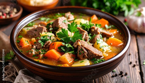 Hearty beef soup in bowl