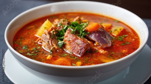Hearty Beef Soup with Vegetables and Herbs in a White Bowl, Close Up