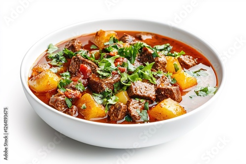 Hearty beef stew with golden potatoes and fresh parsley in a white bowl on white background