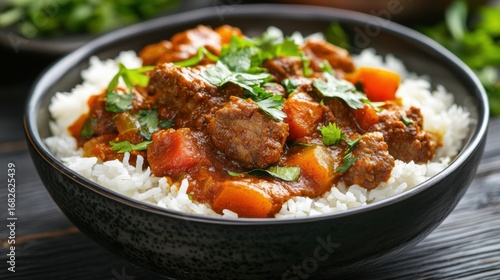 Hearty beef stew with rice and vegetables