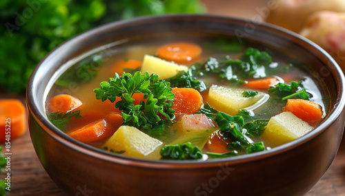 hearty bowl of homemade vegetable soup with chunks of carrots, celery, potatoes, and kale, garnished with fresh parsley.