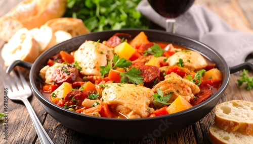 Hearty Chicken Stew with Sausage and Vegetables Served on Rustic Wooden Tabletop