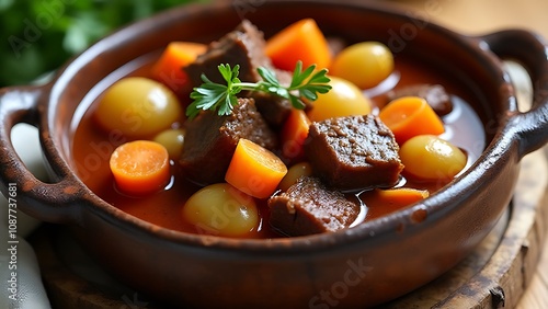 Hearty chunky beef stew made with tender potatoes, carrots, and sweet onions served in a charming rustic bowl together.