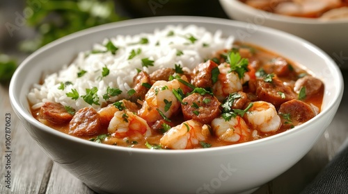 Hearty Seafood Dish in White Bowl with Rice