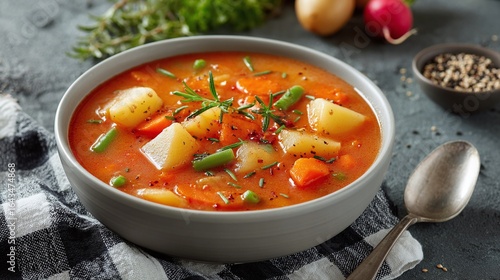 Hearty vegetable soup with carrots, potatoes, and beans served in a bowl, garnished with herbs. A comforting and nutritious meal for any occasion.