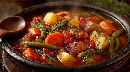 Hearty vegetable stew, steaming hot