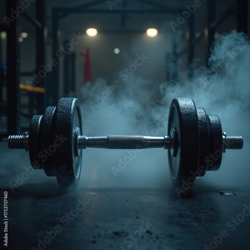 Heavy adjustable dumbbell rests on dark gym floor with smoke. Fitness equipment ready for intense strength training, bodybuilding, powerlifting. Focus, effort, healthy lifestyle, building muscle for