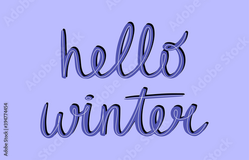 Hello winter on the blue background. Festive illustration. Handwritten lettering with layers, greeting card template. Seasonal banner for social media, advertising and printing