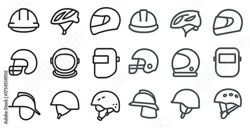 Helmet protection outline icons set – solid, safety, and security symbols