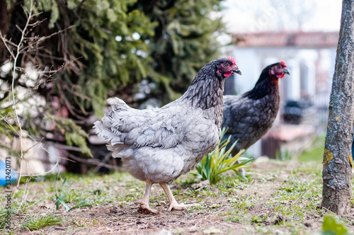 Hens, chickens on farm.