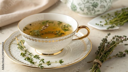 herb native herb herbal tea. A delicate tea cup filled with herbal tea, garnished with herbs, set on an elegant saucer against a light, textured background.