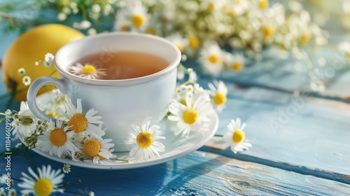 Herbal medicinal tea with chamomile flowers, a bouquet of fresh flowers, on a light wooden background.