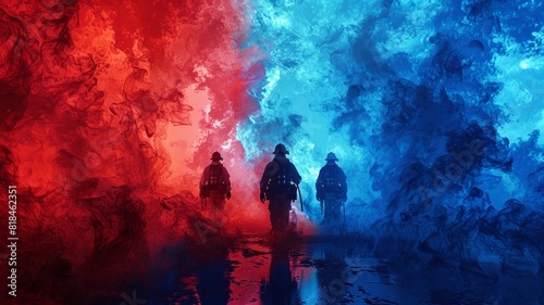 Heroic fire suppression efforts in a burst of fiery red and contrasting deep blue