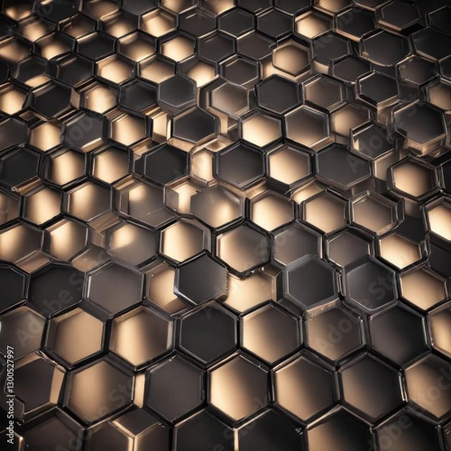 Hexagonal grid of metallic hexagons in light glow, background, texture, abstract