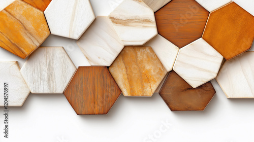 Hexagonal wood and stone pattern. Modern geometric design. Natural textures.