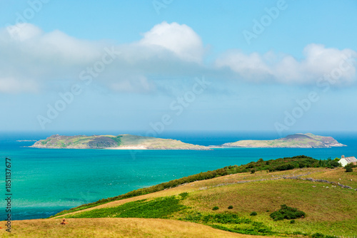 Hidden Scotland. NC500 route. Scenic coastal landscape with islands, green hills, and turquoise sea under clear sky
