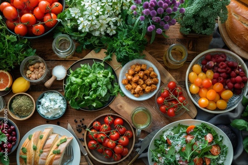 High angle shot of a beautifully arranged table with various dishes, ingredients, and greens visible