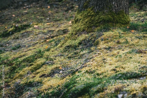 High angle shot of green moss growing on a forest floor