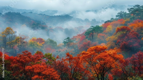 High angle view of a dense forest in autumn, vibrant red, orange, and yellow canopy, serene atmosphere, misty morning light, watercolor painting style, nature landscape