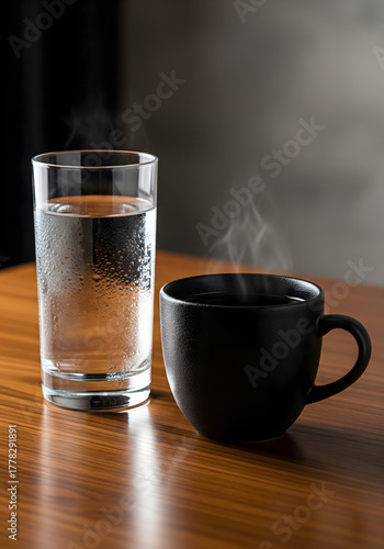 High contrast still life of hot coffee and cold water