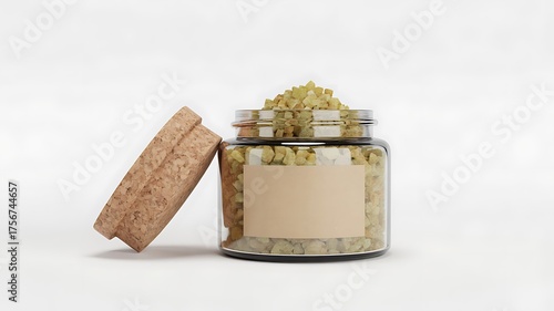 High detail render of glass jar filled with dry ingredients against a clean white surface