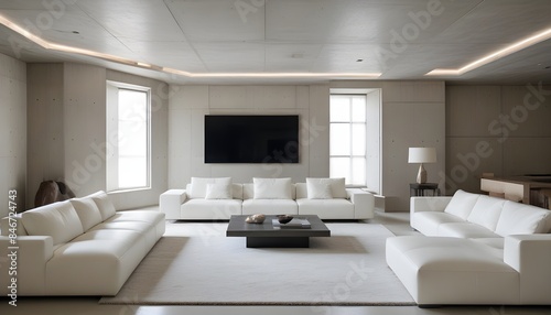 High end modern living room with white leather couch and a large flat screen tv mounted on the wall, brutalist architecture mixed with modern futuristic minimal design