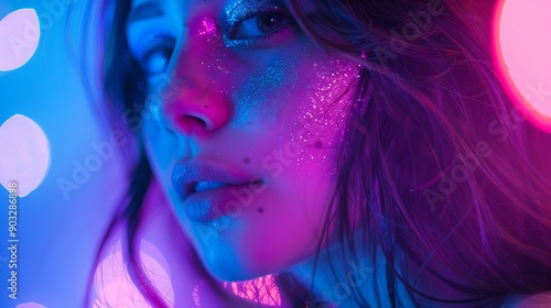 High fashion model metal silver lips and face woman in colorful bright neon UV blue and purple lights, posing in studio, beautiful girl, glowing makeup, colorful makeup. Glitter Bright Neon Makeup