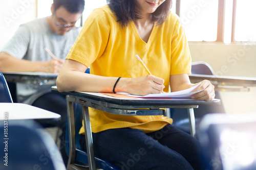 high school,university student study.hands holding pencil writing paper answer sheet.sitting lecture chair taking final exam attending in examination classroom.concept scholarship for education abroad