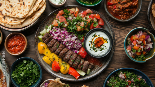 High-angle view of kibbeh with a side of yogurt sauce, vibrant and traditional Lebanese presentation