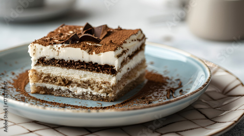High-definition food photography, close-up of Italian tiramisu cake, with distinct layers of coffee-soaked sponge cake and mascarpone cheese layer, the surface dusted with fine cocoa powder, decorated