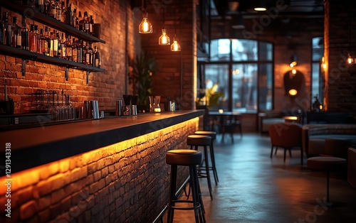 Highend modern bar with a dimly lit atmosphere, rustic brick wall, soft LED backlighting, luxurious seating, minimalist aesthetic, cinematic depth of field, ultraHD 8K