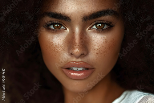 High-Quality Close-Up of Dark Egyptian Woman with Curly Hair and Full Lips: Warm Skincare Ad on White Background