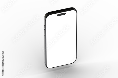 High-quality image of a sleek black smartphone with a blank white screen, perfect for app presentations or website mockups.