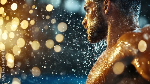 High-resolution close-up image showcasing a swimmer's shoulder muscles with water droplets reflecting light, capturing the essence of athleticism and the beauty of movement in sports.