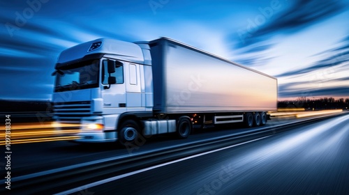 High-Speed Truck on Highway at Dusk with Motion Blur and Dramatic Sky Effects