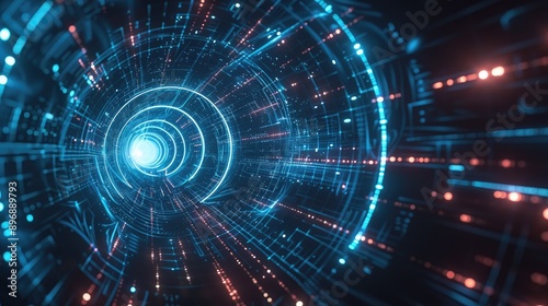 High-tech 3D tunnel with interconnected digital lines and lights