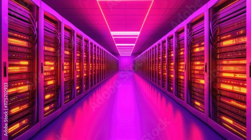 high-tech data center corridor with rows of glowing server racks emphasizing precision and innovation