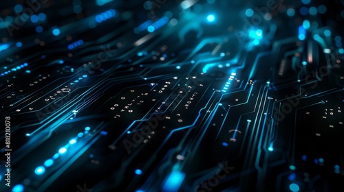 High-tech digital circuit board with blue neon lights. Ideal for technology, electronics, and futuristic designs