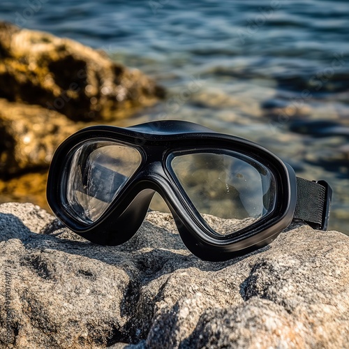 high-tech diving goggles with an adjustable strap and anti-glare lenses resting on a rocky surface near the water's edge.