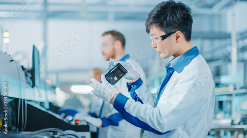 High-Tech Factory: Quality Control Engineer Picks up Visually Checks Smart Electronic Device for Possible Damages. In the Background Assembly Line for PCB with Surface Mount Pick and Place Technology