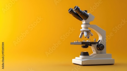 High-tech microscope on a bold yellow gradient background with glowing highlights and sharp focus.